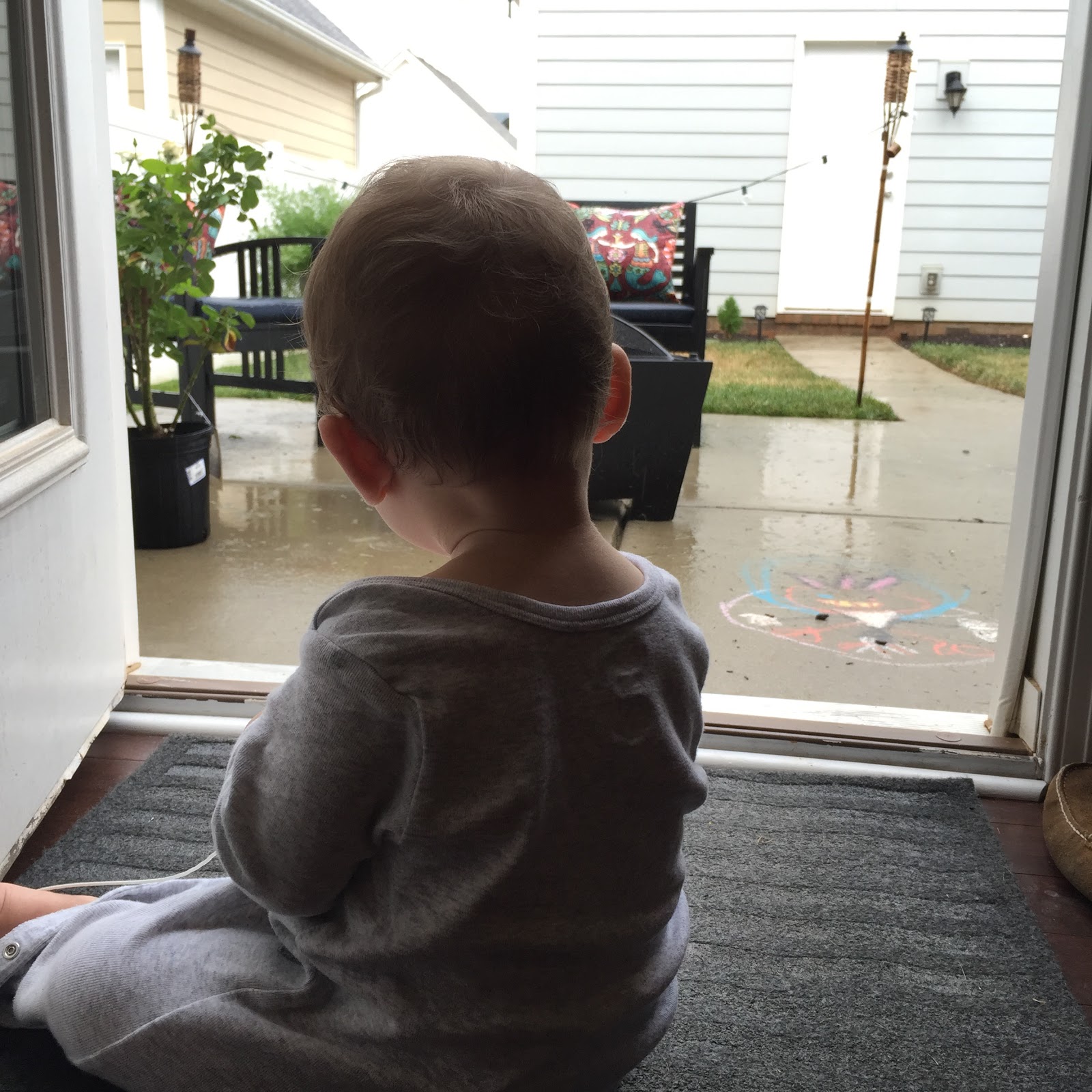 { August is our rainy month and she loves sitting in the door and watching it fall. }
