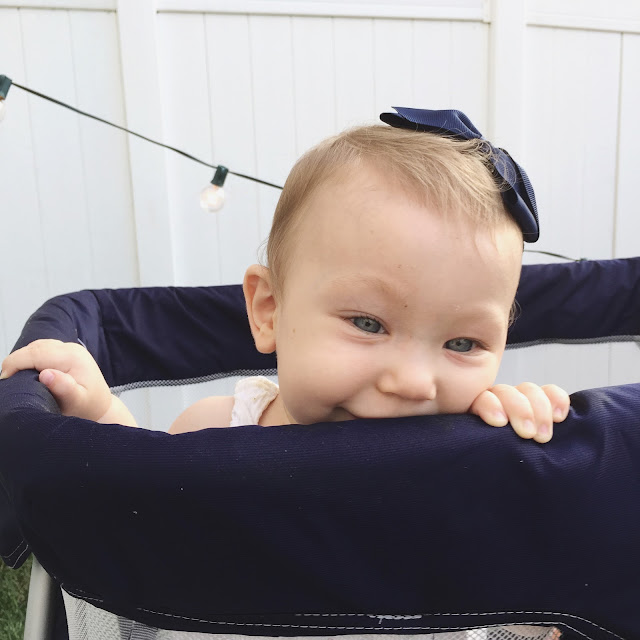 In other news... We have two teeth!! Both bottom teeth are through and she is chowing down on any and all food that we give her. This girl loves to eat and does a great job of feeding herself. Since we have new teeth, she also loves "popsicles" which are just ice cubes in her mesh teether. You say the word "popsicle" and she comes running, well crawling at a really high rate of speed.