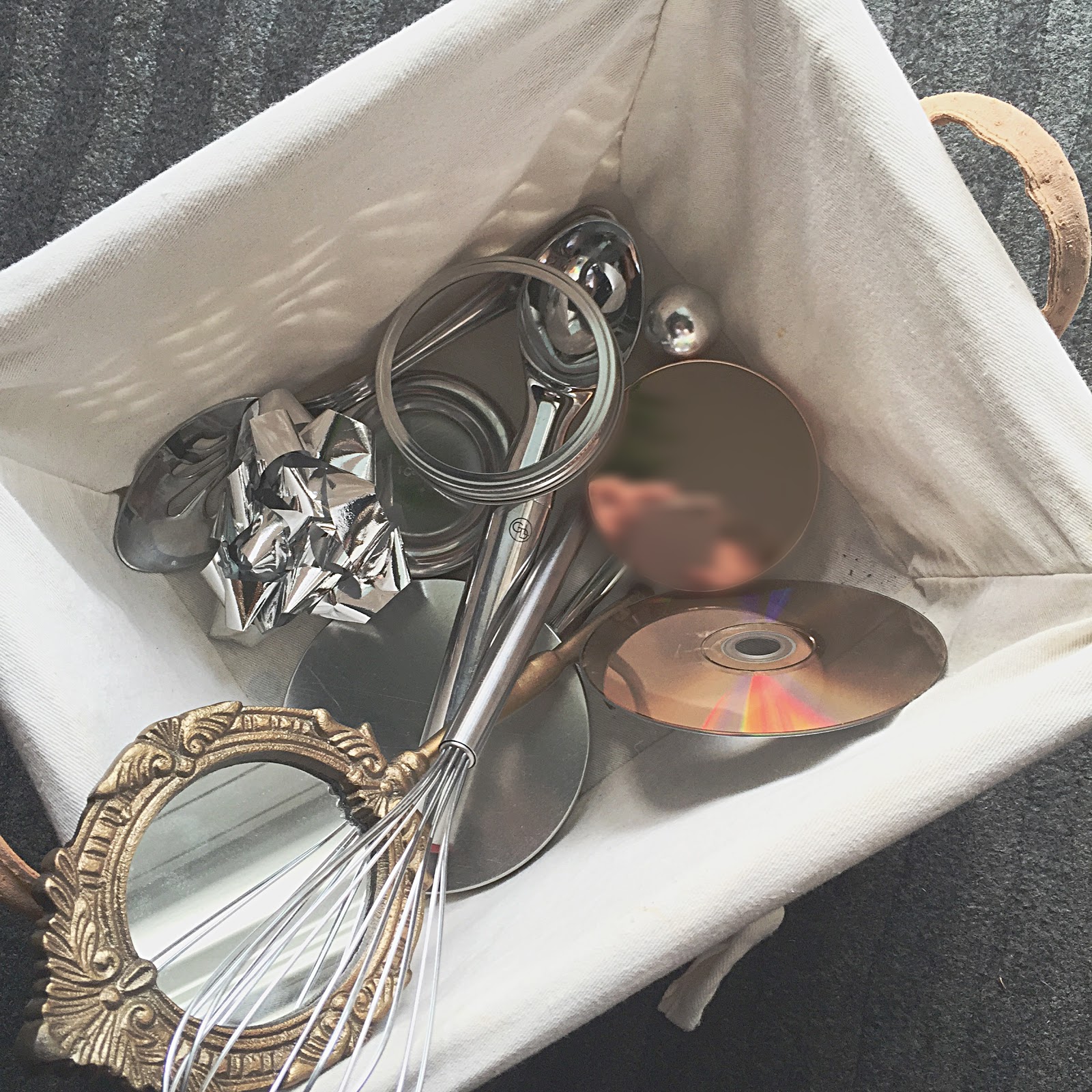 "Treasure Baskets/Discovery Boxes" are part of Heuristic play and you can implement them from the time your baby can sit up until about 18 months. They are baskets full of objects that range from random items to items that share a common attribute, like this reflective items basket I made for Jules a couple months ago.