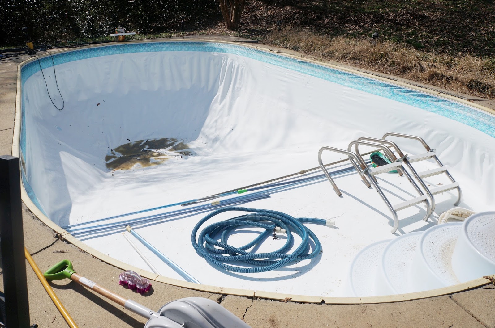 The sun has taken the blue color from the liner but after about 5 gallons of bleach, it's a bright white. White pools...that's a thing, right?