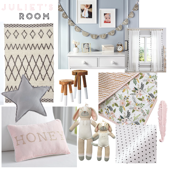 With all those changes going on, I wanted to move on to something a little bit more "fun" and impractical. (And of course... my mind went straight to Jules.) When we moved, we got rid of her wooden & very large, poppy red dresser because... 1- we didn't want to fool with moving big bulky furniture this time around and 2- we knew that in the new house her room would serve as bedroom and playroom so we needed the space. That left us with her gold Jenny Lind crib and the gray Graham glider from West Elm, as far as furniture goes. Kind of a blank canvas really.