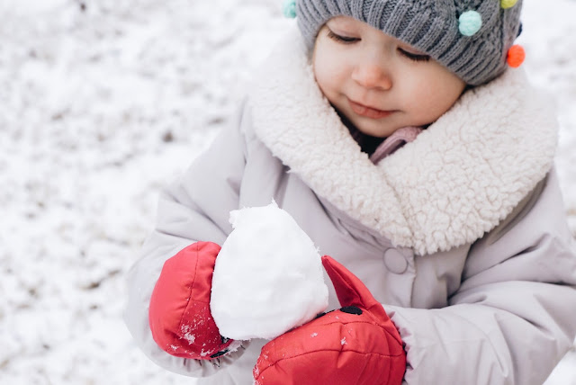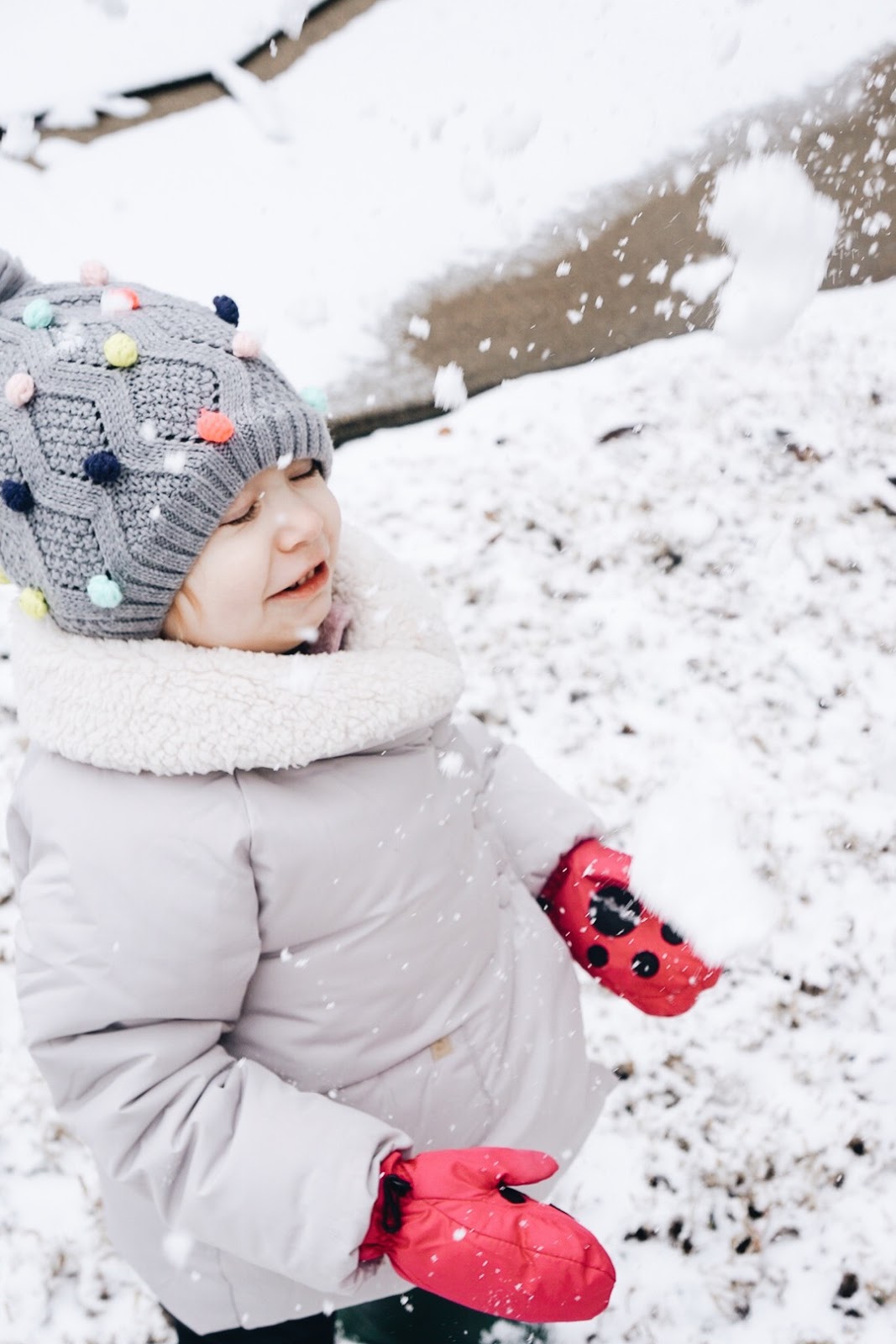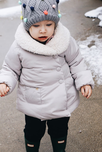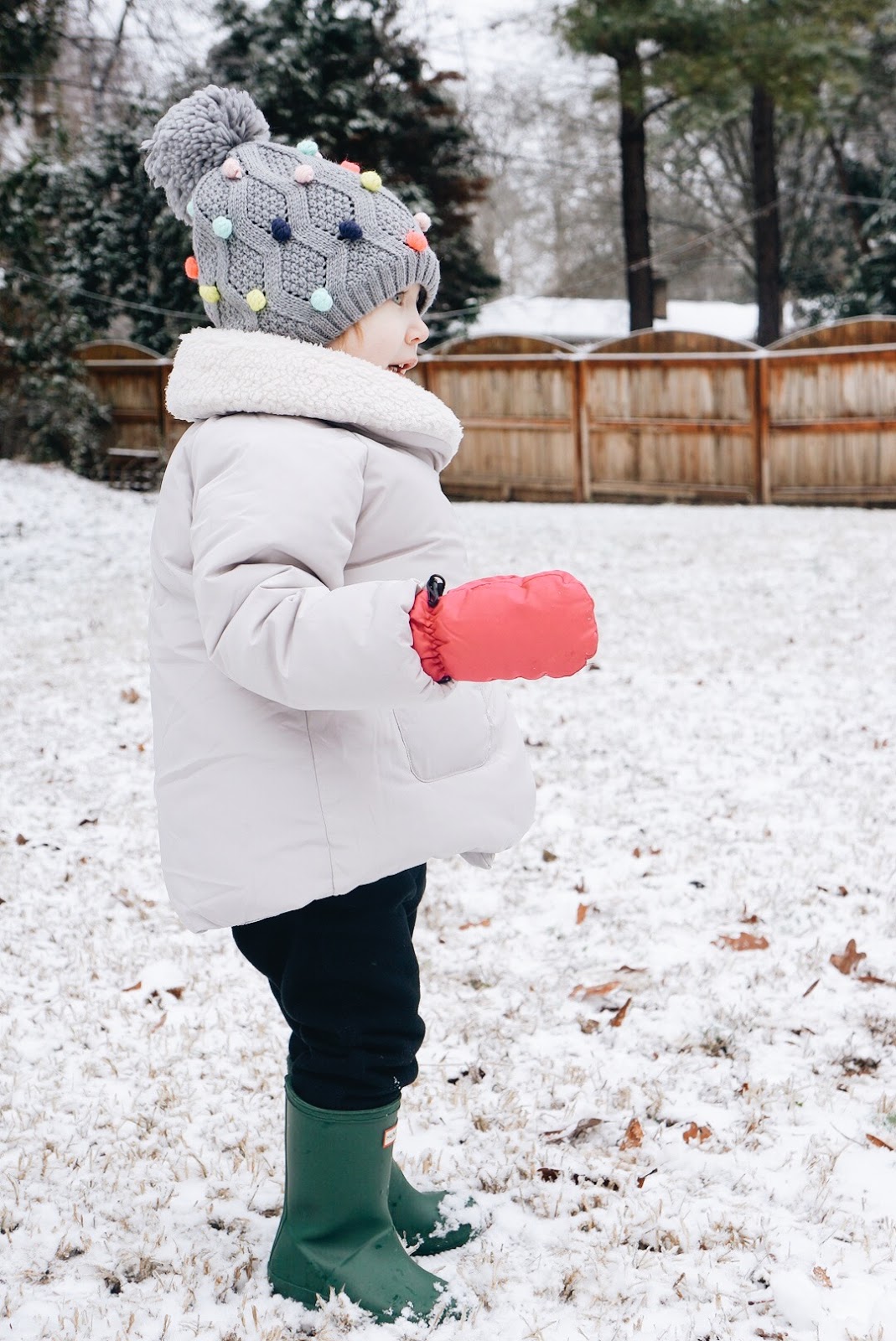 We weren't expecting snow so soon in the year. We usually get one, maybe two snows a year between January and March, and this year it came early! Friday night when we went to bed, it was just sleeting and we were starting to doubt the forecast of 4-8 inches by morning. Nevertheless, we sat our boots out by the door in hopes that we would wake up to a Winter wonderland! Not sure of when it started snowing, but by the time Juliet woke up there was probably two inches of snow in some spots. We waited for it to warm up, then threw on lots of layers and headed outside!