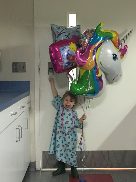 The first picture was taken when she was at her worst and weakest; right before the doctor came in to do the procedure. The ER nurse had let me borrow an iPad that had all the songs from Frozen downloaded onto it and that kept her focused and somewhat alert. The second picture was right after the procedure and we were headed to recovery. The last picture was taken 2 days later and she was feeling back to herself again... hence the boots, balloons, and silly face.