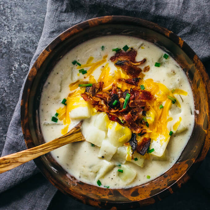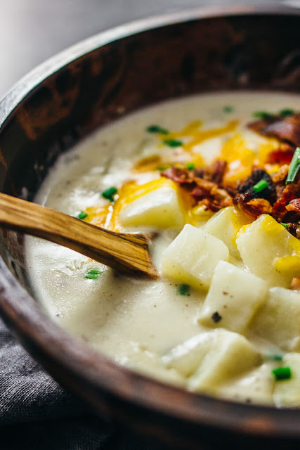 Loaded Baked Potato Soup // One that we love to make during cold months is this loaded baked potato recipe. It's sooo good and extremely simple. It's best with cornbread muffins and garnished with green onions and ALL THE BACON! It's a bag of frozen hash-brown potatoes, 2 cans of chicken broth (14 oz cans), 1 can of cream of chicken soup, 1/2 cup of chopped onion, 1/3 tsp of ground black pepper, 1 package of cream cheese, softened. Combine potatoes, broth, soup, onion, and pepper; cover and cook on low for 5 hours. Stir in cream cheese and cook for additional 30 minutes, stirring occasionally. Garnish with green onions, shredded cheddar and bacon.