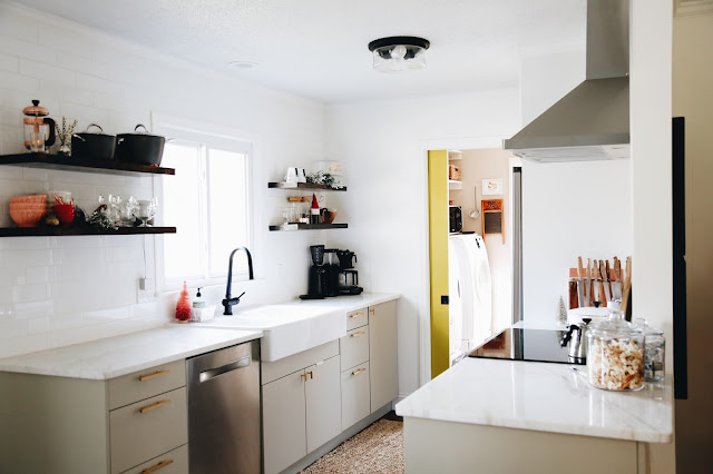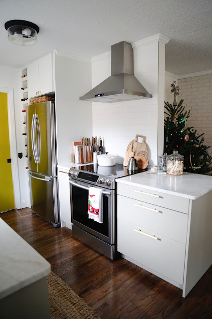 It's absolutely insane looking at before and after pictures of our kitchen. The kitchen was the first renovation that we began after moving into our house last year and you can find progress posts here, here, and here. We took our time and made sure each decision that we made was exactly what we wanted. The time waiting was worth it and I'm so excited about all the baking and decorating that's going to happen in this space for Christmas!
