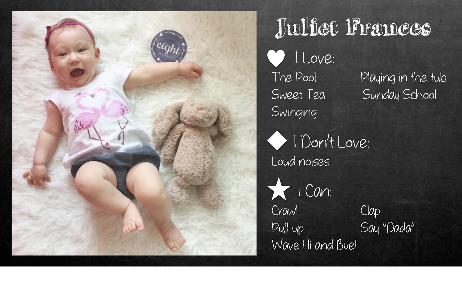 I hope everyone had a fantastic and safe 4th of July weekend! This month has been her busiest yet, as far as development goes. We've been climbing the stairs, clapping when music comes on, (which turns from this mad attempt to put her hands together, to opening and closing them vigorously... It's seriously the cutest thing to watch those pudgy little fingers trying to create sound), talking jabbering, waving hi and bye to anyone that will look her way, crawling and pulling up!