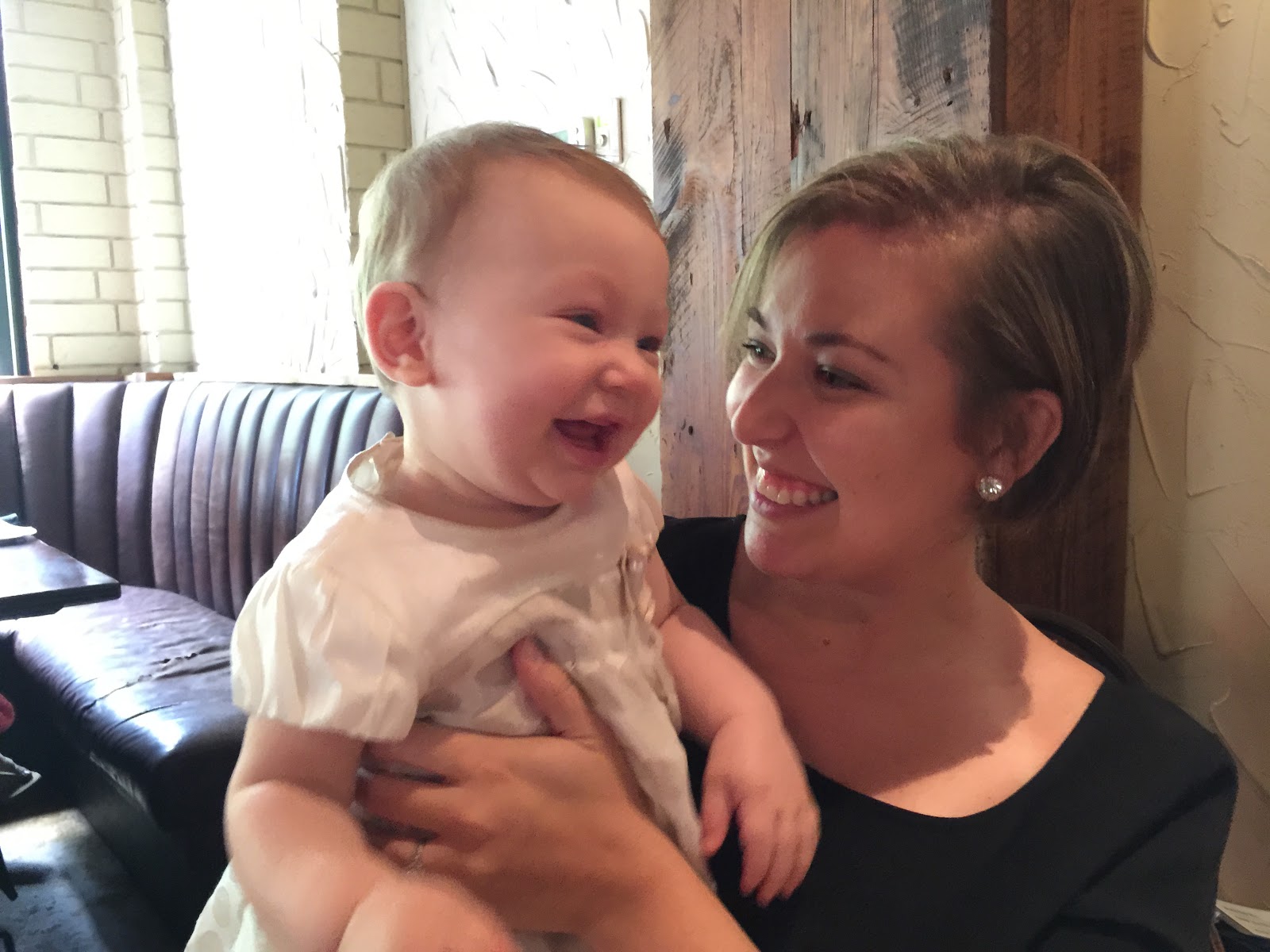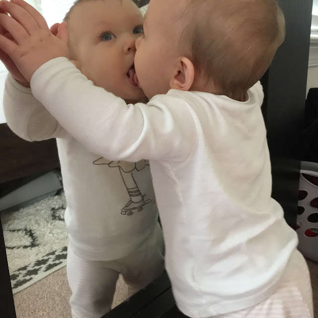 Whew! This past month has been a doozie! Almost to the day of our sweet girl turning 8 months old, she began teething something fierce. She quit sleeping and started drooling and gnawing on anything, everything, or anybody. It took her most of the month, but her 2 bottom/front teeth popped through- finally! Because I'm not going to a job early in the mornings, I'm able to be up with her on those restless nights and it's made it a lot easier for all of us. However, Joey has become quite the "Daddy Robot". The moment she makes a sound his feet hit the floor- awake or not. It's honestly hysterical to witness!