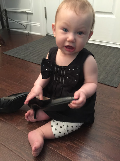 Keep a bow in this girls hair if you can. If it isn't a headband- it ain't stayin'. Her hair is getting fuller and has good body too! I actually fixed it with Davines Sea Salt spray and it gives it lots of volume. It's our first thing to share as momma & daughter... She obviously can't wear my shoes yet.