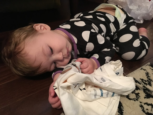 Other Milestones: We've been working on walking. She still walks a little pigeon toed and marches when she's taking steps. The movements are still pretty foreign to her. We have another month to work on that. We'll get there! She got her first haircut this month. Her hair was all different lengths, so we just had the girl even it all. She also got her "big girl" car seat this month, (as one of her Christmas gifts). Shakes her head "NO!" Can blow kisses and point her finger in the air (or at people). She will randomly give a shout out to Jesus while playing.