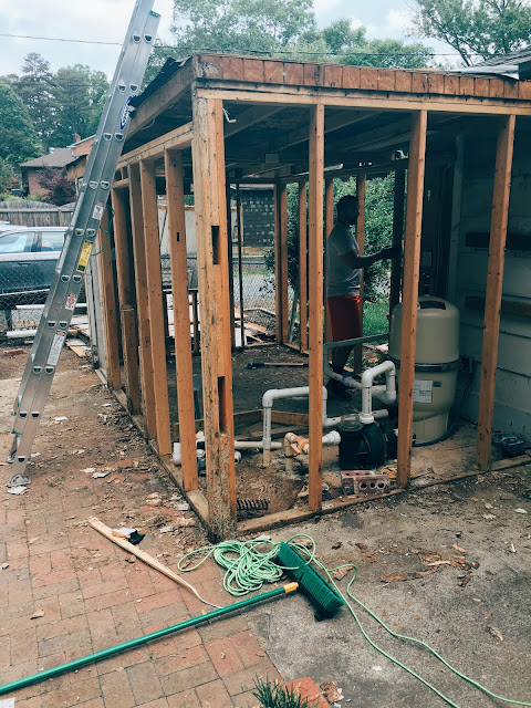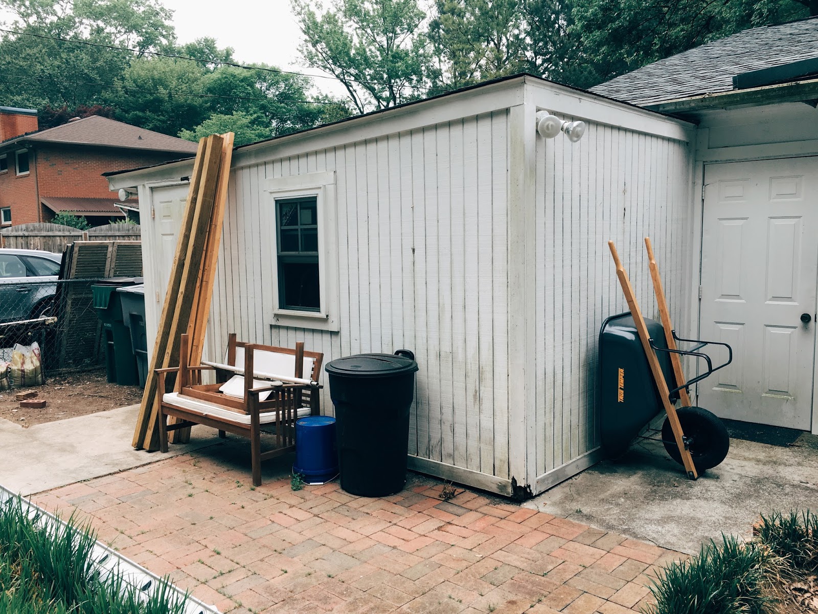 Pay no attention to the man behind the curtain broken down shed there... in about 3 minutes it will be gone. It was a later addition to the house, we're thinking mid 1990s because of comments from neighbors. It was a weirdly shaped, white box that made you think of the word "goiter" when you looked at it. Inside it housed our pool pump & pool supplies- we were secretly hoping to find something a little bit more interesting, but that was pretty much it. We were told when we moved in that it needed a new roof because of improper pitch, that it had wood rot on the exterior substrate, & it was causing water damage in other parts of the house... then on top of AAALL that, it looked like this.