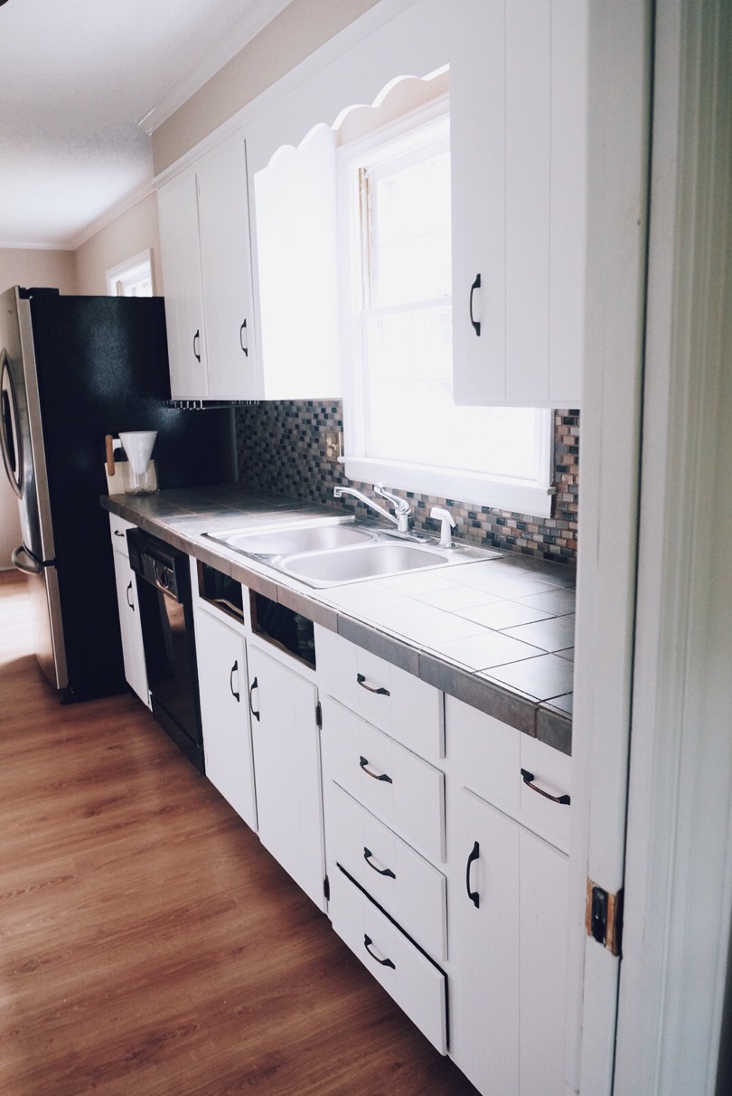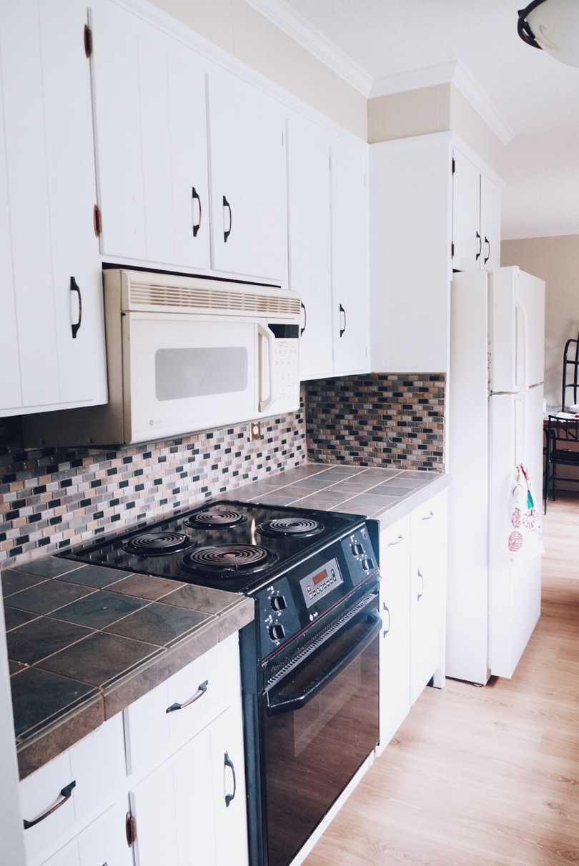 It was a typical 1960s kitchen with white wooden cabinets and tile countertops.