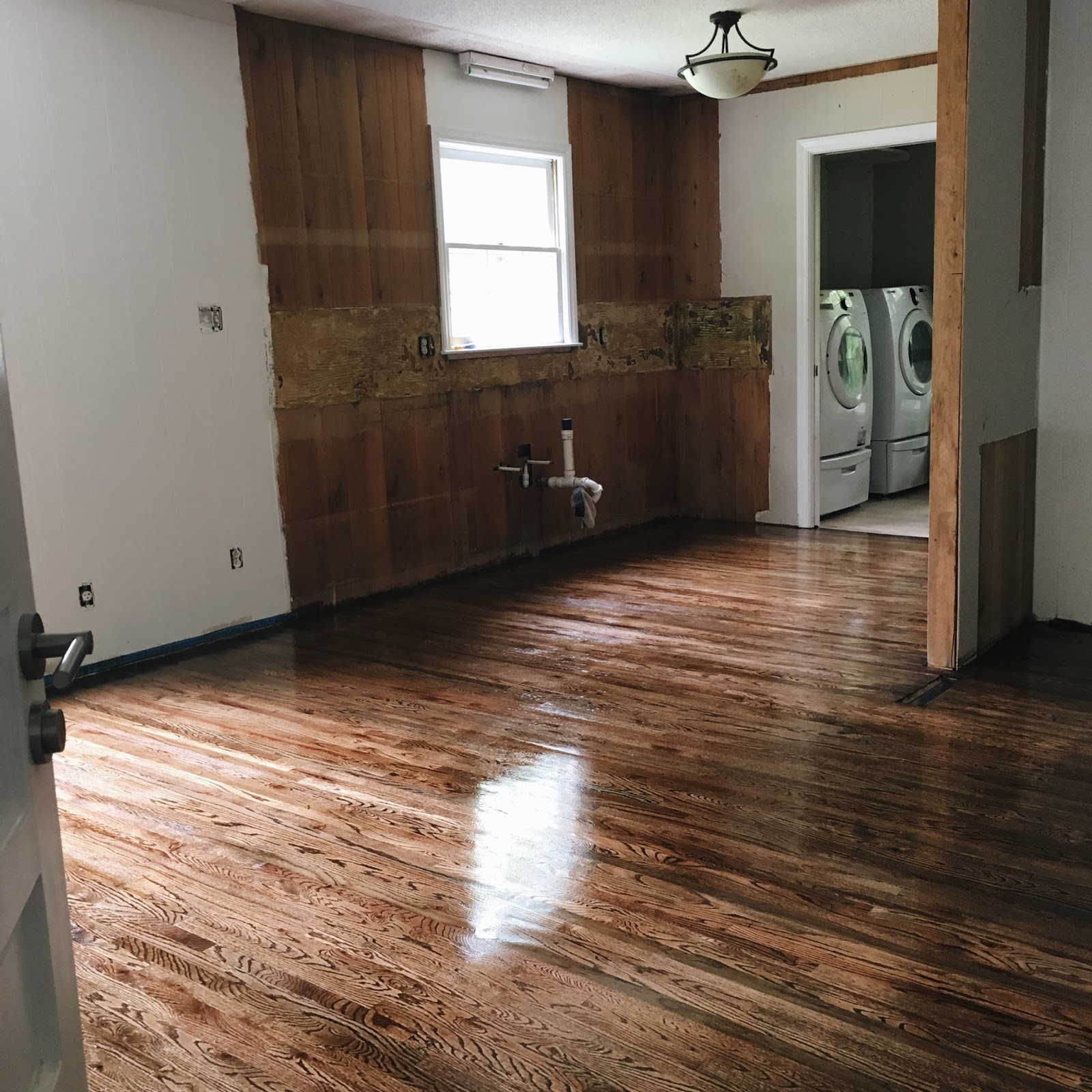 Hardwoods are now installed- all shiny and new! The next steps are to removed paneling and hang backer board in it's place in preparation for a wall full of tile! Yipp-eee!