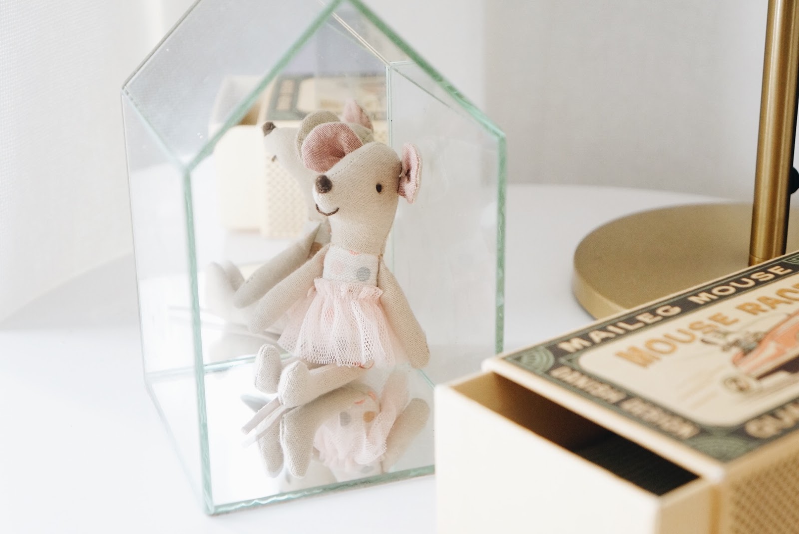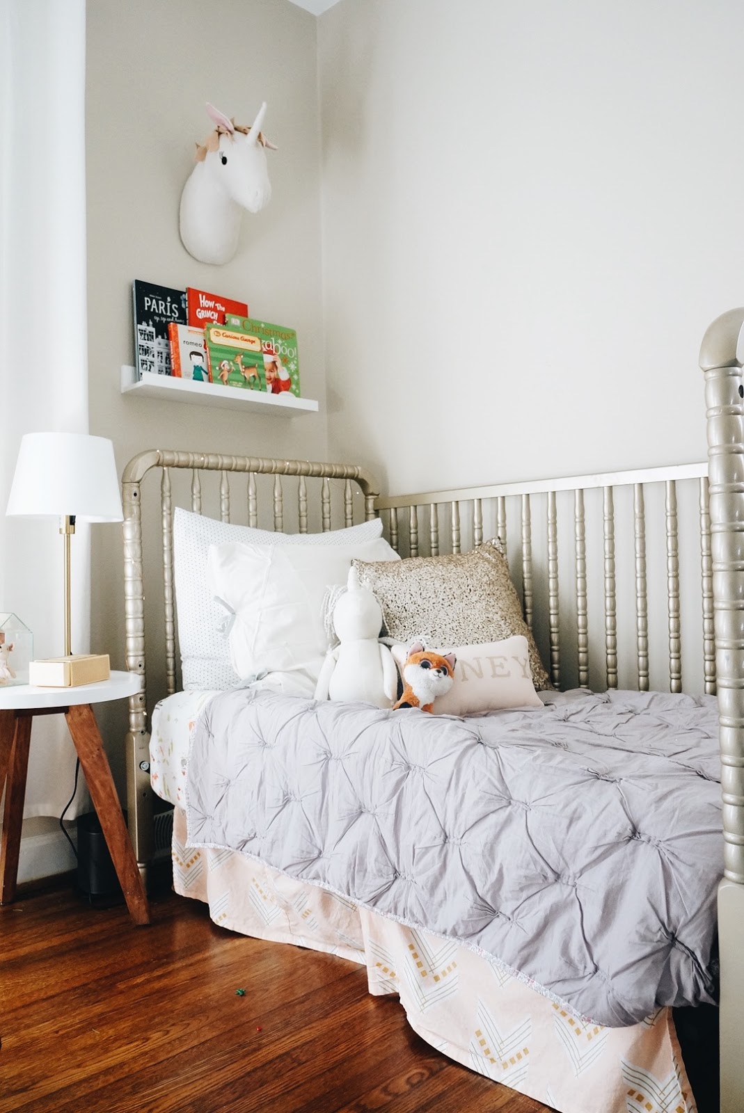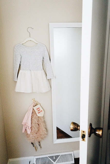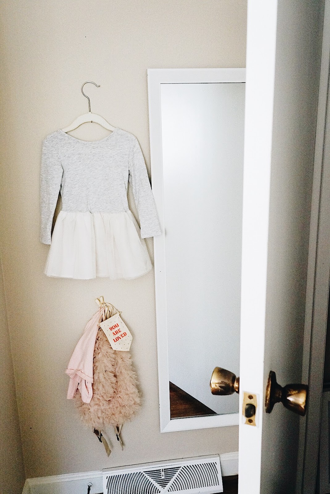 We love the room so far, but I have a few things I want to add to make it more efficient and fun. Like hooks for this corner behind her door where we usually keep her outfit for the next day and her backpack. I'm thinking about getting either these from Anthro or these from LON. I should also note that I plan to paint her room this peachy blush pink paint color by Benjamin Moore called Mauve Hint. We plan to move out her chalkboard and art table into the study to give her more floor space to play. We're just waiting on that space to be "finished". On to the next room!