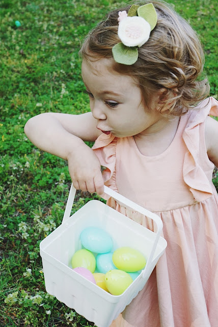 We came home after lunch with the family and hunted eggs in our yard. I didn't stuff those eggs with anything and Juliet kept opening each then looking at me like, "what's your angle woman"... After realizing that the eggs were empty it became her mission to give them all to me instead of putting them in her basket. I think it was her subtle way of telling to put candy in them.